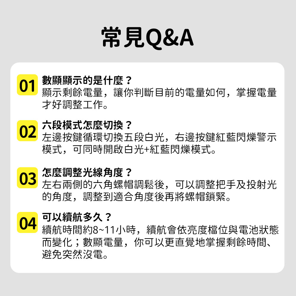 A4.續航時間約 8~11 小時,續航會依亮度檔位與電池狀態而變化;數顯電量,你可以更直覺地掌握剩餘時間、避免突然沒電。